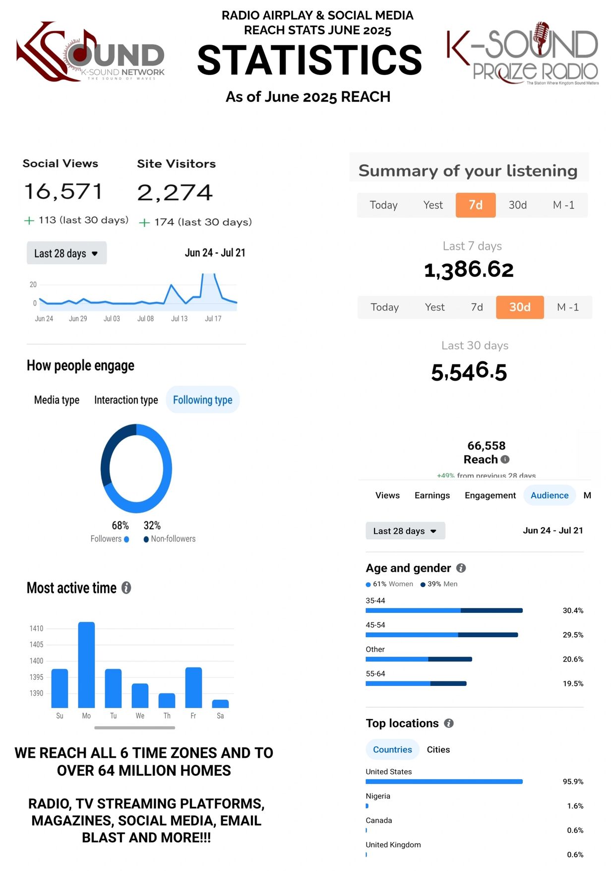 Our stats are updated Monthly so Our potential clients or clients will stay updated with our reach through our station followers, listeners, social media following, and the percentage those who interact with us all around the world...