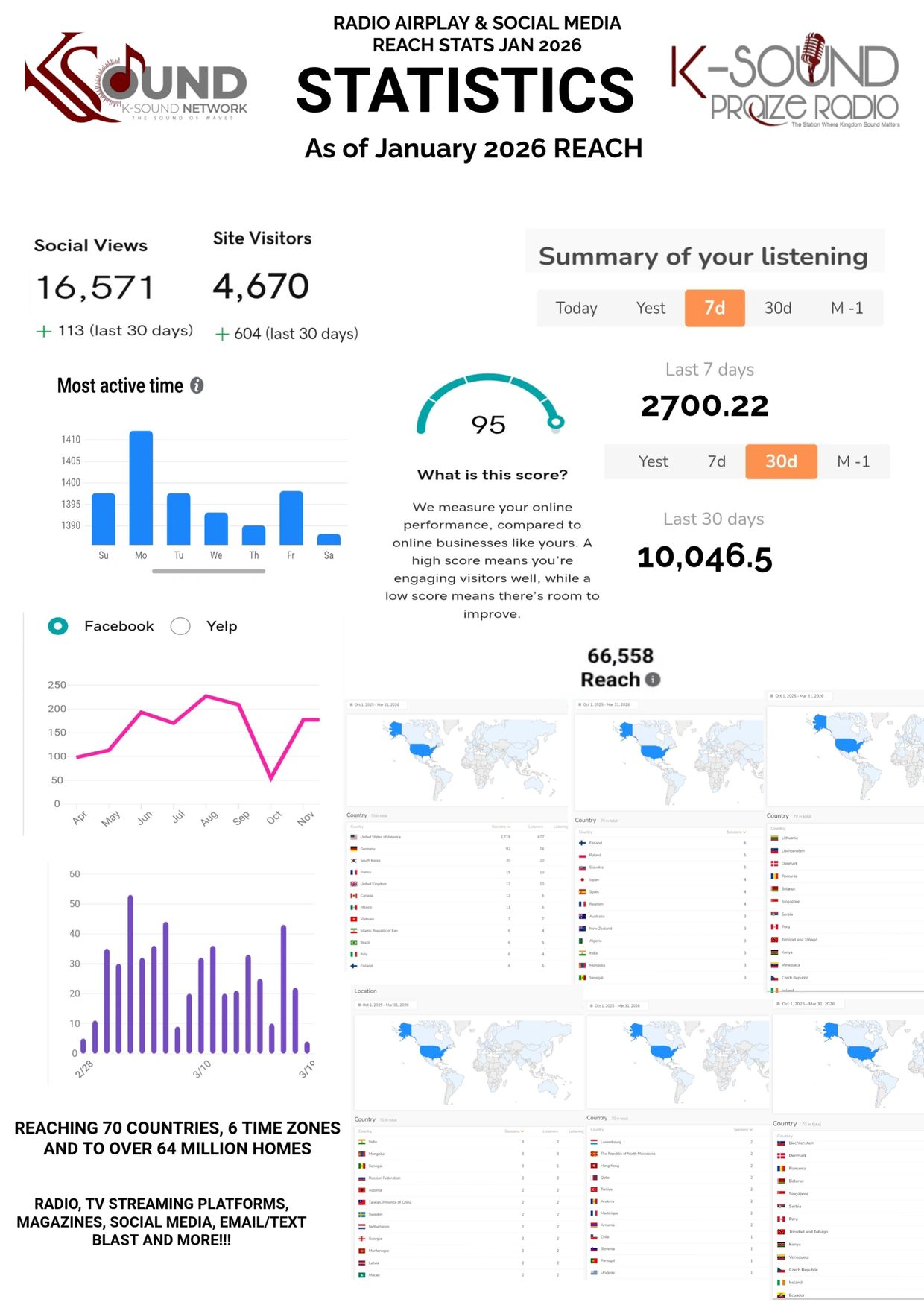 Our stats are updated Monthly so Our potential clients or clients will stay updated with our reach through our station followers, listeners, social media following, and the percentage those who interact with us all around the world...